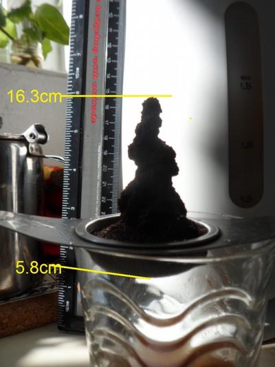 This morning’s coffagmite was a fine specimen, 10.5 cm high (allowing for parallax and the ’end bit’ of the ruler) so I thought I’d throw out a challenge.