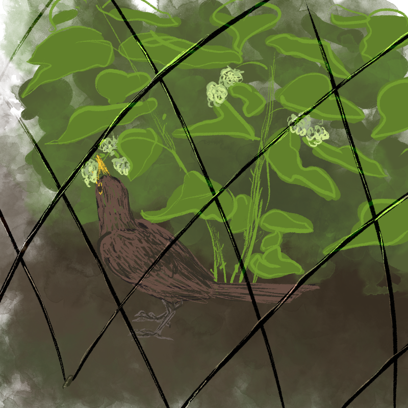 Last Thursday a carer, who also does some gardening, and I, made a cage around the raspberries using some bamboo poles and pigeon netting. As my wife D says, we don’t want the raspberries escaping. As the carer and I worked, a young blackbird (let’s call her Polly) sat few feet away in a red currant bush, plucking green berries and swallowing them whole. It shows how dry the ground is that Polly’s preferred food - earthworms - are not available. Possibly the berries are are not only food but also provide moisture. Why doesn’t she drink and bathe in my bird bath? Usually Polly and her kind will wait until the berries start to redden before stealing them but Polly risked being close to humans to eat them green and sour. The carer chatted to Polly and got within arm’s length before Polly fluttered a few feet away. As soon as the cage was finished she was back.