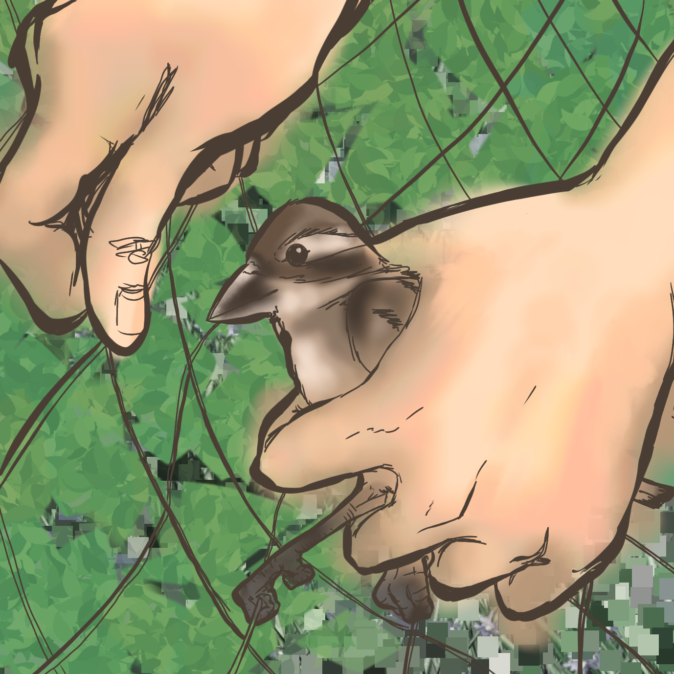 I wrote in my blog ‛Life and Death in the Garden’ about some sad incidents with wildlife trapped inside Fruit cages or tangled in the netting. Today as I prepared breakfast, I looked up the garden and saw four small brown birds outside the raspberry cage. They repeatedly fluttered up the outside of the netting, sometimes clung to it for a few seconds and then dropped back to the ground. I walked up to investigate and found three young sparrows inside the raspberry cage. I wondered how on earth they’d got in but my priority was to get them out.
