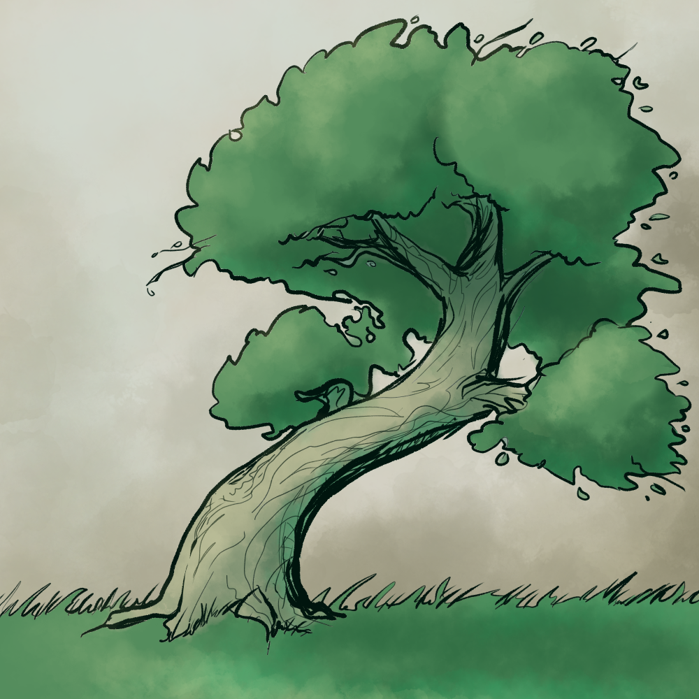 An old tree, bent and gnarled, the bark moss laden, cracked and knotted standing firm against the stormy blast.