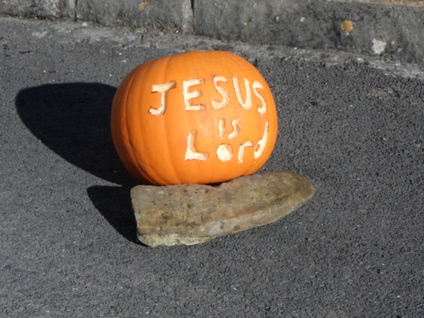 I have always wanted to do something spiritually positive for Hallow E’en without harping on the dangers of evil spirits or demons - I certainly couldn’t mention the latter to five-year-olds and send them home to have nightmares. In the end I asked one granny, known for her children-friendly craft skills, if she and her grandchildren could make a pumpkin with a smiley face and a crown on top. I agreed to carve ‘Jesus is Lord’ into another.